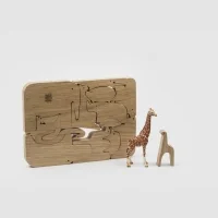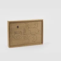 Designed by Enzo Mari in 1957 for Danese Milano, 16 Animals is one of the best-known examples of educational design applied to design. Made of solid oak, this puzzle consists of sixteen animal shapes cut from a single board, with a single cut determining their shape and how they fit together. Each element can be removed from the mother structure and arranged freely, transforming the game into a creative and spatial experience. The object combines the idea of educational play with a high level of formal and constructive rigour, becoming both a tool and a piece of furniture.