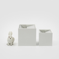 The Cubo ashtray by Danese Milano, designed by Bruno Munari, bases its design strength on two simple elements: a cubic shell open on one side and a metal sheet inserted inside it with an acute angle cut. This configuration allows the ashes to slide inside, reducing the visibility of the contents and transforming the function into an aesthetic gesture. Made of non-flammable melamine for the outer structure and removable aluminum for the inner insert, Cubo reflects Munari's rational and poetic approach, becoming a functional and iconic furnishing accessory.