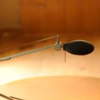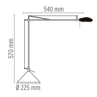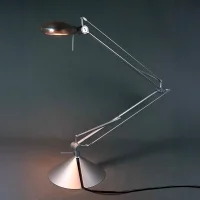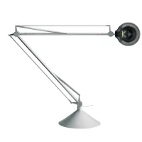Table lamp with direct and diffused light. Black diffuser with translucent finish. Injection-molded PC (polycarbonate) diffuser, vacuum-aluminized inside. Grey painted die-cast aluminum diffuser support. Grey painted assembly composed of extruded aluminum arms, steel tie rods, stainless steel springs, and 50% fiberglass reinforced, injection-molded polyamide joints. Gray painted die-cast Zamak BASE.