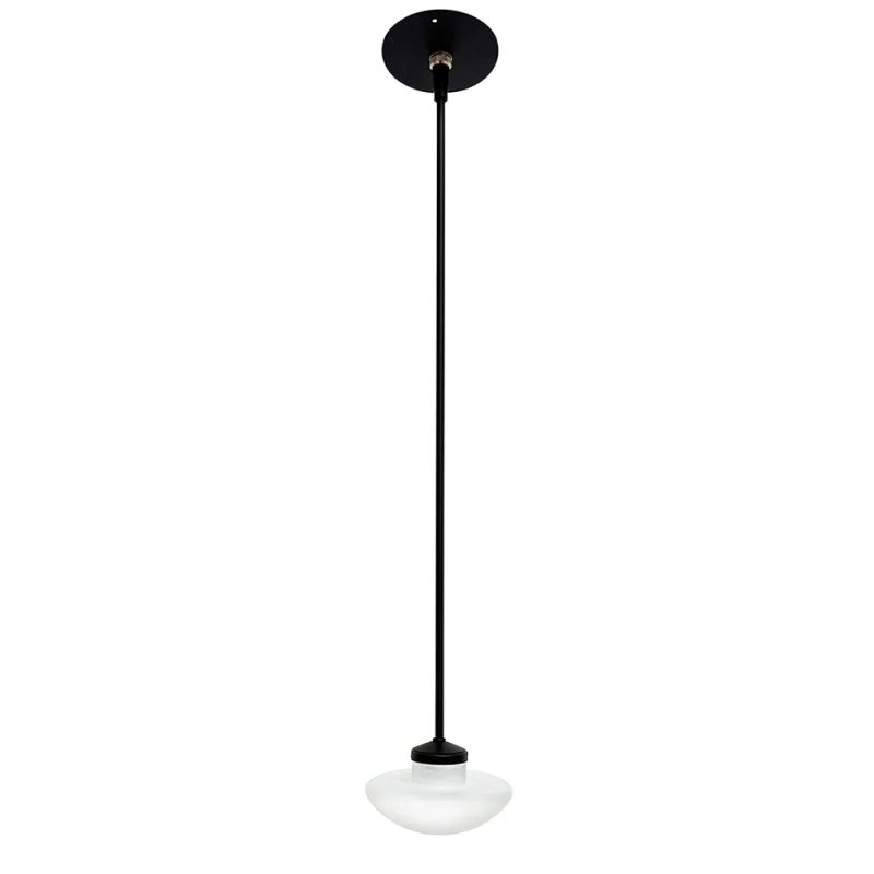 Sillaba pendant lamp by FontanaArte with a 36 cm fixed stem and a plug-in ceiling rose. Black or chrome metal frame and white satin-finish blown glass diffuser. Available in Ø 9, 12, and 14 cm. Limited edition lamp.
