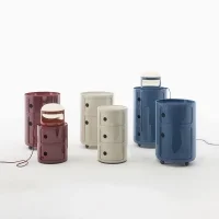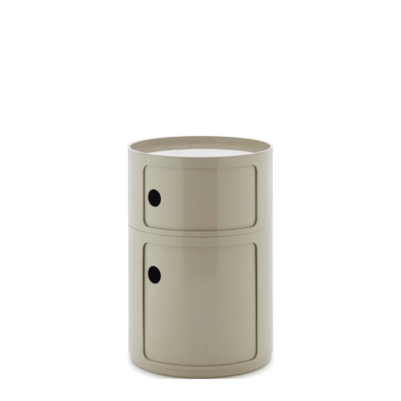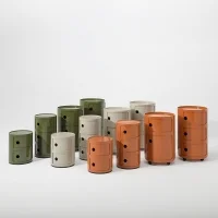 Thanks to a new industrial mould, the 42 cm round version of Componibili reveals its quality and aesthetic appeal. The colour palette is enriched with the new 2025 finishes already available in the 32 cm version and the addition of new shades that combine contemporary spirit and historical references. Available in 2 or 3 elements configurations, the elements of the new version cannot be divided, but the wheel kit can be fitted. It can be used both indoors and outdoors.