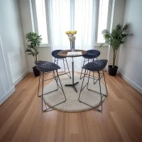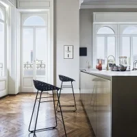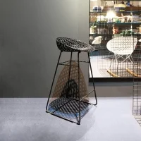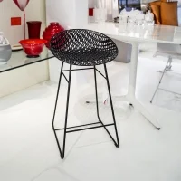 Smatrik Stool Indoor is made of 2.0 polycarbonate from renewable raw materials using a mold that recreates a three-dimensional, overlapping, and intertwined network. Thanks to a special injection technology, the layers of transparent or mass-colored polycarbonate create a single-molded structure that simulates the shape of a metal mesh. For indoor use only.