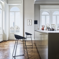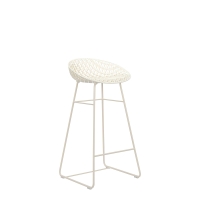 Smatrik Stool Outdoor is made of 2.0 polycarbonate from renewable raw materials using a mold that recreates a three-dimensional, overlapping, and intertwined network. Thanks to a special injection technology, the layers of transparent or mass-colored polycarbonate create a single-molded structure that simulates the shape of a metal mesh. For outdoor use.