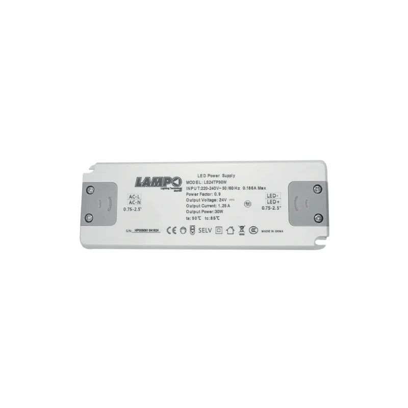 Slim plastic power supply for LEDs in 24V, in constant voltage, capacity 35W 1.25A, for indoor use in energy class II. Input current 200-240V. Thin dimensions: 17 x 155 x 50mm. Equivalent to Snappy model: SNP30-24VF-3