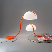 Serpente Terra by Martinelli Luce is an iconic floor lamp, designed by Elio Martinelli in 1965, which represents a perfect synthesis of organic design, functionality, and technological innovation. Made with cutting-edge production techniques for its time, this lamp is now considered a masterpiece of Italian design. Its body consists of an adjustable tubular arm that rotates around a central pivot, allowing the diffused light to be directed with great freedom. The white opal methacrylate diffuser, obtained through thermoformed molding, emits a soft and enveloping light, ideal for creating a warm and welcoming atmosphere in living rooms, studies, or contract spaces. The sinuous shape of the arm, which wraps harmoniously around the round metal base, lends balance, movement, and visual lightness, transforming the lamp into a sculptural object of great elegance. Every detail, from the curvature of the arms to the finish of the materials, is the result of in-depth technical and artisanal research conducted by Martinelli Luce. With its fluid and timeless aesthetics, Serpente Terra continues to be one of the most recognizable symbols of modern design, capable of enhancing any environment with its refined and distinctive presence.