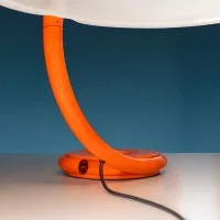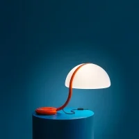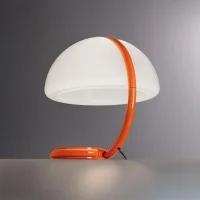 Serpente 60 by Martinelli Luce, an iconic table lamp designed by Elio Martinelli in 1965, symbol of Italian design and formal experimentation in the 1960s. Made with innovative techniques for the time, it represents a perfect balance between art, technology, and functionality. The body of the lamp features a flexible tubular arm that can be adjusted around a central pivot, allowing the direction of the light to be modulated easily and smoothly. The white opal methacrylate diffuser, obtained through thermoformed molding, emits a soft and enveloping diffused light, ideal for creating relaxing and sophisticated atmospheres. The sinuous shape of the arm, which elegantly wraps around the round metal base, gives the lamp a sense of dynamism and harmony, making it a true sculptural piece of furniture. Every detail of the Serpente 60 is the result of in-depth technical and artisanal research, aimed at ensuring aesthetic and functional balance. Even today, Martinelli Luce's Serpente is considered a masterpiece of Italian design, capable of enhancing modern, classic, or contemporary environments with its elegant and timeless presence.