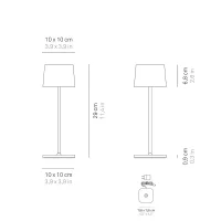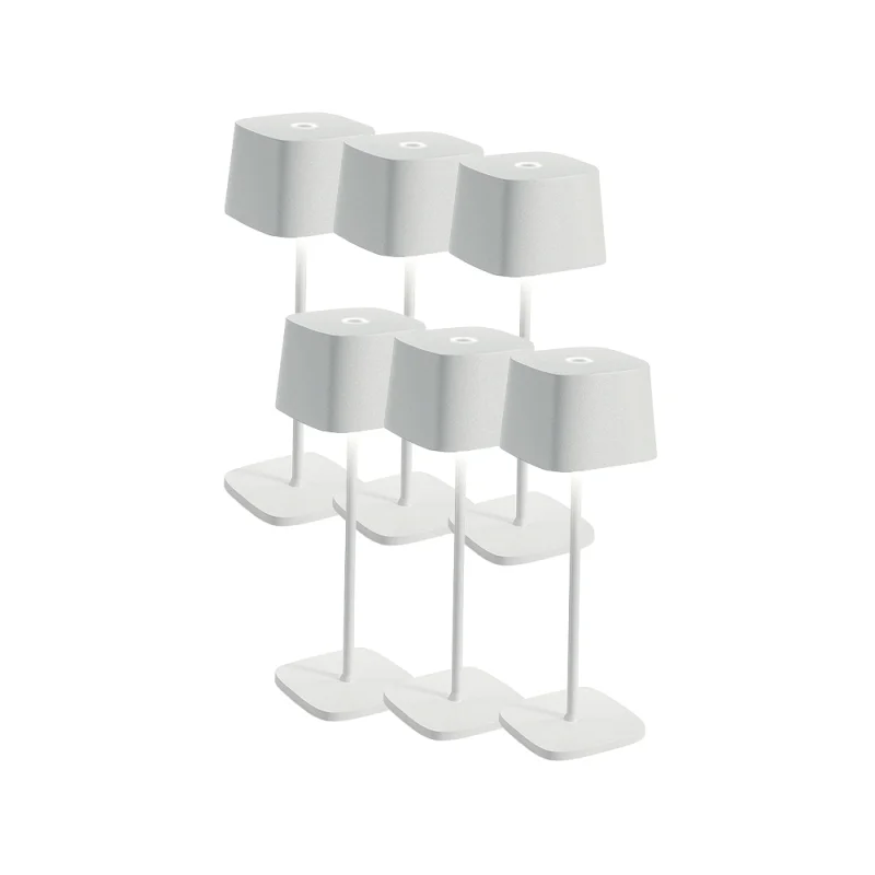 Pack of 6 rechargeable portable battery-powered lamps, Olivia model. Portable and rechargeable table lamp, equipped with touch controls on the top that allow you to turn it on, adjust the light intensity, and select the color temperature of the light. It has a memory function that saves the last brightness level set: each time it is turned on, the lamp automatically restores the previously selected intensity. Thanks to its high degree of protection, the lamp is also ideal for outdoor use, guaranteeing resistance to humidity and atmospheric agents. Perfect for domestic, professional, or catering environments, the pack of 6 Olivia lamps combines functionality, elegance, and versatility in a single solution.