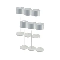 Pack of 6 rechargeable portable battery-powered lamps, Olivia model. Portable and rechargeable table lamp with an elegant and functional design. The practical touch control located on the top of the head allows you to turn on the lamp, adjust the light intensity, and select the color temperature. The lamp has a memory function that saves the last brightness level set, allowing you to find the same intensity every time you turn it on. Thanks to its high degree of protection, it is also suitable for outdoor use. Ideal for domestic, commercial, or catering environments, this pack of 6 Olivia lamps combines practicality, autonomy, and style in a single versatile solution.