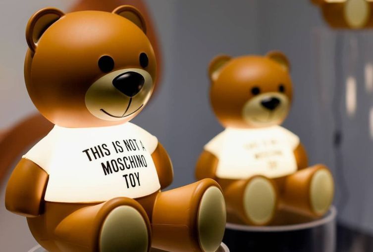 Toy presenta poi sulla pancia la scritta "This is not a Moschino Toy", mentre la luce morbida fuoriesce dalle varie parti opaline creando un’atmosfera calda ed elegante. Oltre alla versione classica, si presenta in una nuovissima finitura oro metallizzato che va ad arricchire il glamour dell'orsetto, diventando un oggetto di arredo prezioso.