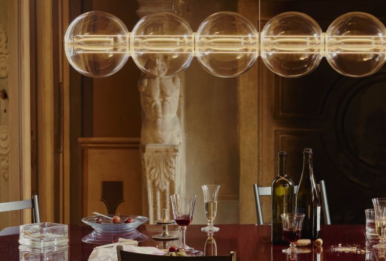 Immagina una fila di sfere di vetro soffiato che sembrano librarsi nell’aria, come bolle di sapone che catturano la luce. È questa la magia di Luce Sferica, la nuova creazione di Ronan Bouroullec per Flos. La struttura nasce da un corpo centrale in alluminio estruso — sottile, preciso, industriale — su cui scorrono due strisce LED dimmerabili, una orientata verso l’alto e l’altra verso il basso, in un gioco continuo di riflessi e trasparenze.