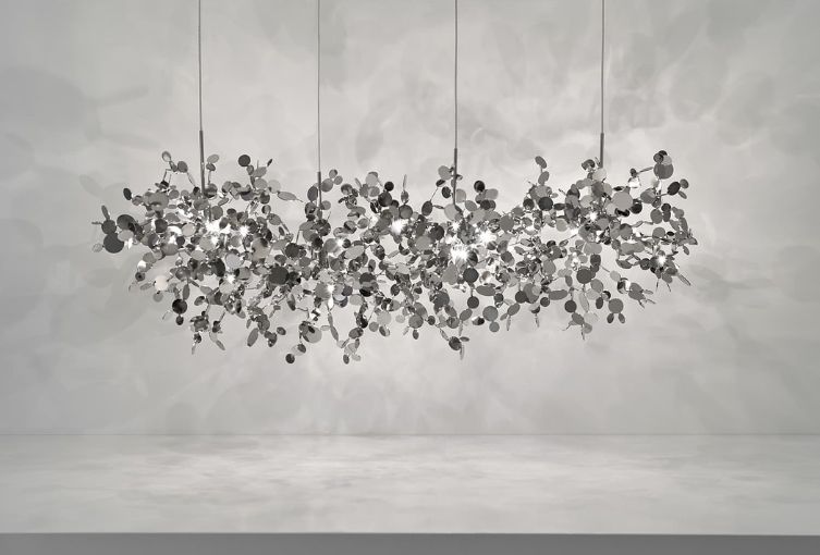Anche il metallo è un materiale centrale nella filosofia di Terzani. Nella lampada Stream, i fili metallici sono disposti con precisione per creare un effetto etereo e allo stesso tempo moderno. Lo stesso vale per Argent, dove i dischi argentati creano una texture luminosa che dona un aspetto contemporaneo e lussuoso.