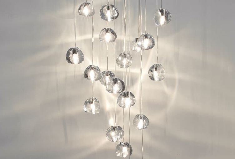 ispirata alla purezza dell'acqua, la lampada a sospensione Mizu si presenta in diverse configurazioni: con sette, cinque e tre luci, oltre alla versione classica a una sola luce.
