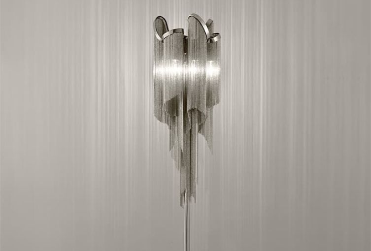 la lampada da terra Stream è un capolavoro di design e ingegneria. Realizzata con una cascata di fili metallici lucenti, che sembrano scorrere come un flusso d'acqua, questa lampada emette una luce diffusa e affascinante.