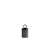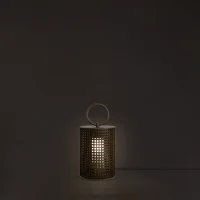 Muse lantern lampada da terra IP65, con struttura laccato bronzo, maniglia in cuoio intrecciato marrone e diffusore acrilico color ambra. Disponibile in due dimensioni.