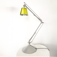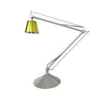 Lampada da tavolo a luce diretta e diffusa. Diffusore interno in vetro borosilicato pressato con finitura acidata. Diffusore esterno in PC (policarbonato) stampato ad iniezione alluminato con processo di alluminazione sottovuoto sulla parte interna. Supporto diffusori in lega di alluminio pressofuso, verniciato di colore grigio a liquido. Assieme struttura, verniciato a liquido di colore grigio, composto da bracci in lega di alluminio estruso, tiranti di acciaio, molle in acciaio inossidabile e giunti in poliammide rinforzata con il 50% di fibra di vetro stampati ad iniezione. BASE in lega di zama pressofusa, verniciata di colore grigio a liquido.