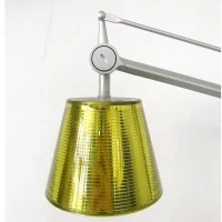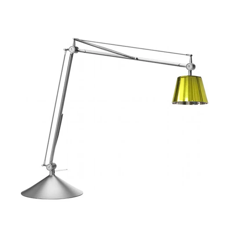 Lampada da tavolo a luce diretta e diffusa. Diffusore interno in vetro borosilicato pressato con finitura acidata. Diffusore esterno in PC (policarbonato) stampato ad iniezione alluminato con processo di alluminazione sottovuoto sulla parte interna. Supporto diffusori in lega di alluminio pressofuso, verniciato di colore grigio a liquido. Assieme struttura, verniciato a liquido di colore grigio, composto da bracci in lega di alluminio estruso, tiranti di acciaio, molle in acciaio inossidabile e giunti in poliammide rinforzata con il 50% di fibra di vetro stampati ad iniezione. BASE in lega di zama pressofusa, verniciata di colore grigio a liquido.