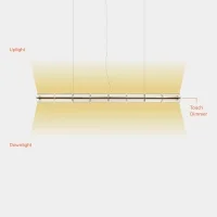 La lampada è composta da un corpo orizzontale altamente tecnico, realizzato in alluminio estrus lucidato, che ospita due strip Led: una con emissione verso il basso e l'altra verso l'alto. A una delle due estremità della barra è presente un dimmer touch innovativo che consente di selezionare l'emissione della luce solo verso l'alto, solo verso il basso oppure entrambe e di regolare in modo indipendente l'intensità luminosa di ognuna. Il corpo della lampada viene racchiuso da una sequenza di sfere in vetro leggere e trasparenti con diametro uniforme, realizzate tramite la soffiatura del vetro. Le sfere centrali presentano due fori passanti mentre quelle terminali hanno un'apertura unica. Il lato opposto è chiuso da una superficie piatta che si allinea con l'estremità del modulo luminoso. Le sfere sono separate una dall'altra da distanziatori tradizionali che compensano le piccole variazioni di diametro tipiche della produzione artigianale.
