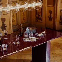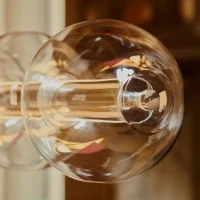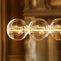 Luce Sferica è una creazione di Ronan & Erwan Bouroullec che ricerca la delicatezza e la bellezza della semplicità, come gocce di pioggia o bolle di sapone. Sulla base scorrono sfere di vetro soffiate a bocca, con una precisione tecnica che esprime bellezza e poesia.