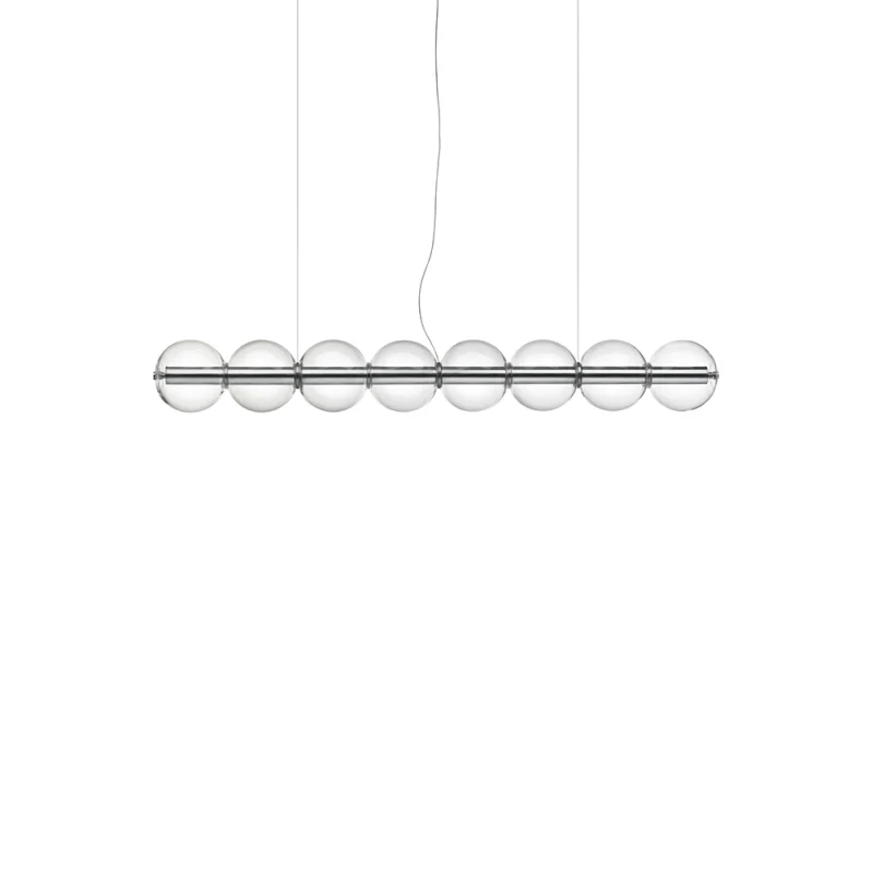 Luce Sferica, lampada a sospensione composta da moduli sferici. Sfere in vetro, struttura interna in alluminio. Disponibile in tre diverse lunghezze.
