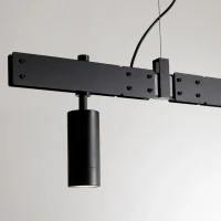 Stant Circolare di Karman è un sistema a binario sospeso dal design elegante e contemporaneo, disponibile in due dimensioni. Realizzato in alluminio nero opaco con sfere in vetro satinato.
