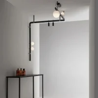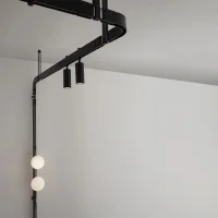Stant di Karman è un sistema modulare a binario per soffitto e parete dal design essenziale e contemporaneo, realizzato in alluminio nero opaco con sfere in vetro satinato.