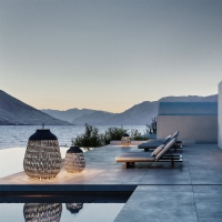 Lodes Stitch, collezione lampade da tavolo o da terra per ambienti esterni nella variante small e medium. Realizzate in metallo ricoperte con nastro in tessuto. Disponibile in diverse dimensioni e finiture.