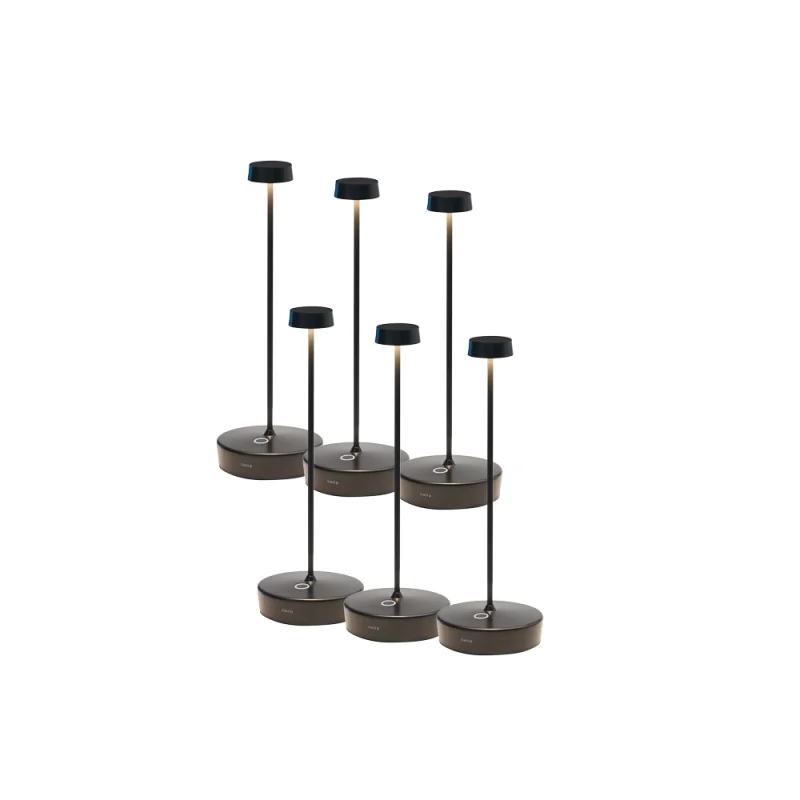 Pacco da 6 lampade portatili a batteria ricaricabili, modello Swap. Lampada da tavolo portatile e ricaricabile, con controllo touch integrato sulla base che consente l’accensione, la regolazione dell’intensità luminosa (dimmerazione a 4 step) e la selezione della temperatura di colore della luce. Dotata di un alto grado di protezione, è adatta anche all’uso esterno, garantendo resistenza a umidità e agenti atmosferici. La nuova versione Swap presenta un’altezza ridotta (29 cm), rendendola ancora più pratica e versatile. Dispone di un sistema di controllo elettronico che monitora e segnala l’autonomia residua della batteria, ottimizzando i cicli di ricarica per mantenerne le prestazioni nel tempo. La lampada è inoltre personalizzabile con paralumi in vetro, ceramica o tessuto (acquistabili separatamente), per adattarsi a diversi stili e ambienti. Il pacco da 6 lampade Olivia Swap rappresenta una soluzione elegante e funzionale per l’arredo di spazi interni ed esterni, domestici o professionali.