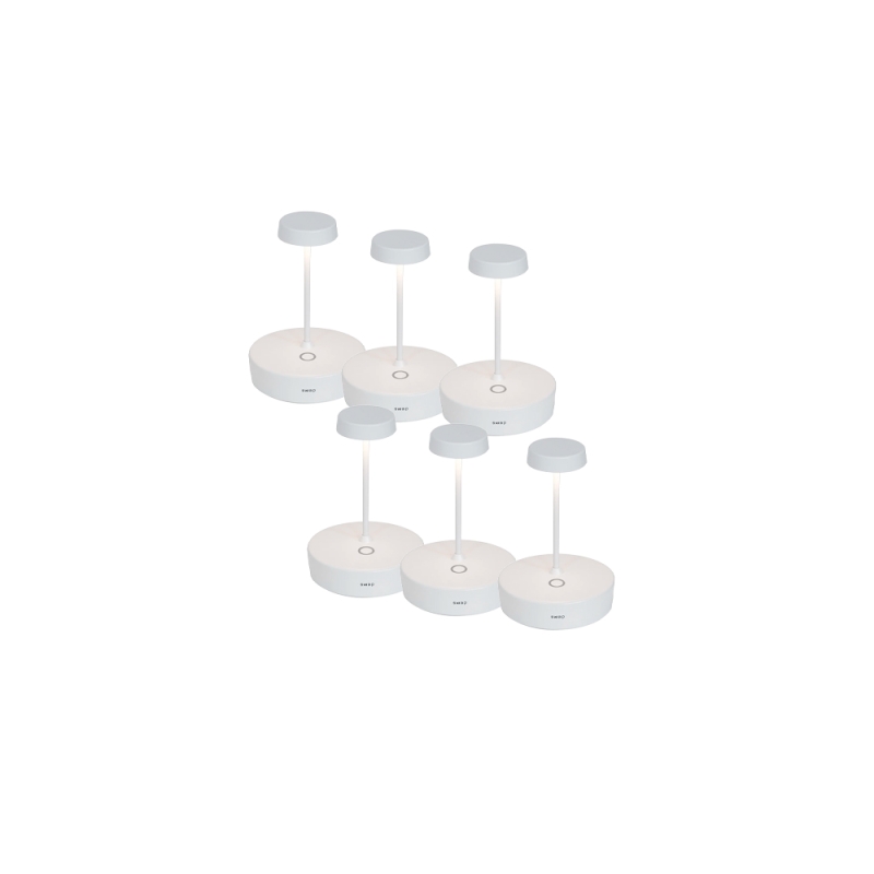Pacco da 6 lampade portatili a batteria ricaricabili, modello Swap Mini. Lampada da tavolo portatile e ricaricabile, dotata di controllo touch sulla base che consente l’accensione e la regolazione dell’intensità luminosa. Grazie al suo alto grado di protezione, è adatta anche per uso esterno (ad eccezione dei modelli con finitura galvanica, per i quali è sconsigliato l’uso continuativo all’aperto). Dispone di un sistema di controllo elettronico che monitora e segnala l’autonomia residua della batteria, permettendo di ottimizzare le ricariche e mantenerne l’efficienza nel tempo. Compatta, elegante e funzionale, la Swap Mini è la soluzione ideale per illuminare con stile spazi interni ed esterni, sia domestici che professionali.